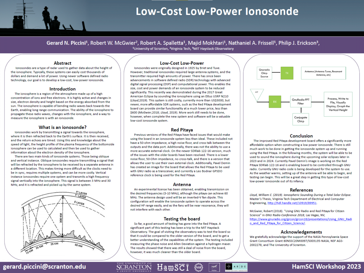 | Abstract | Ionosondes are a type of radar used to gather data about the height of the ionosphere. Typically, these systems can easily cost thousands of dollars and demand a lot of power. Using newer software defined radio technology, our goal is to develop a low cost, low power ionosonde. |